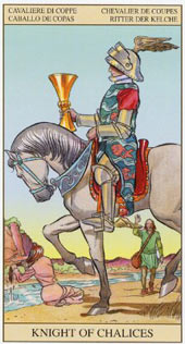Рыцарь Кубков означает добрую, дружескую атмосферу, хорошее настроение и мудрую улыбку. Это время медитации, ощущение гармонии, романтические мечтания и готовность влюбиться. Там, где царили раздоры и конфликты, эта карта провозвещает примирение и покой. Это и просто часы отдыха, время, когда мы даём волю своему воображению, радуемся красоте жизни, наслаждаемся искусством, особенно музыкой.