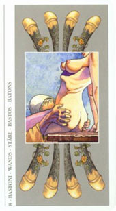 В прямом положении карта может означать, что в ближайшее время вам придется принимать решения - быстро и конкретно - на уровне "да" или "нет", причем от того, какое решение вы примете, будет зависеть очень многое. Восьмерка скипетров - очень скорпионья карта, поэтому ситуации, которые она задает, резки и бескомпромиссны. Единственное, чем можно утешиться, что это не самая сильная карта, и чтобы она проявилась в раскладе в полную мощь, необходима достаточно сильная поддержка других карт. Неплохо заглянуть и в гороскоп. Если в раскладе действие Восьмерки скипетров можно отнести кпрошлому, то не исключено, что эта карта символизировала решения, принятые слишком поспешно. Некоторые описания трактуют Восьмерку посохов как карту мира, гармонии и процветания. Но... применительно к ней, это все же - мир на склоне спящего вулкана.